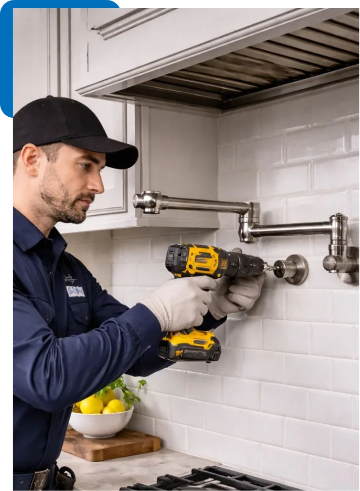 Installing a pot filler requires running a water line to your cooking area, either through the wall (for wall-mounted models) or through the countertop (for counter-mounted versions). The process typically involves opening the wall to run new copper or PEX water lines from an existing supply, installing proper mounting supports, adding shut-off valves for safety, closing and finishing the wall, and mounting the fixture. This is not a DIY project as it requires professional plumbing knowledge, possible wall modifications, and familiarity with building codes. Our technicians handle all aspects of installation, typically completing the project in one day depending on your kitchen’s layout.